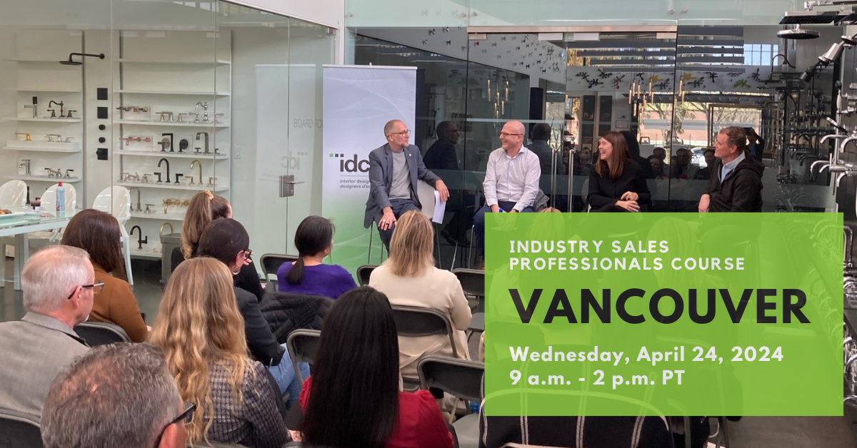 Industry representatives and interior designers are invited to join IDC on Wednesday, April 24 in Vancouver for the first 2024 offering of the celebrated Industry Sales Professional Course (ISPC), returning to the beautiful Cantu Bathrooms & Hardware showroom. IDC offers a custom course, tailored exclusively to meet the needs of architecture and design industry sales professionals, and an opportunity to learn, network, and connect!