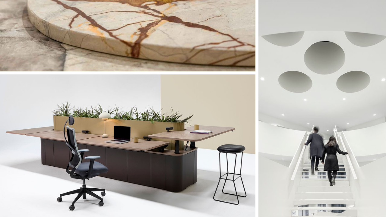 Products featured: (top left) “All-Over” Porcelain Slab Technology by M2 Tile & Stone Inc., (bottom left) Vox® Community by Nienkamper, (right) Rockfon® Mono® Acoustic by Rockfon North America