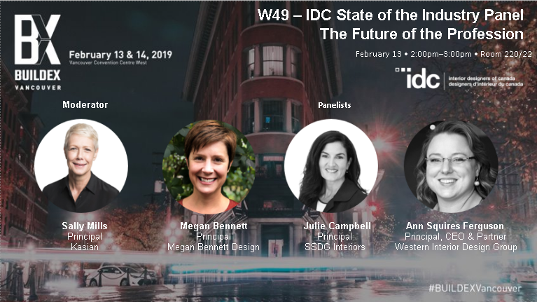 Sally Mills, president of IDC and principal of the firm Kasian, moderated the discussion, and was joined by panelists Megan Bennett, registered interior designer and president of the Interior Designers Institute of British Columbia, Julie Campbell, partner at SSDG Interiors and Ann Squires Ferguson, the CEO of Western Interior Design Group.