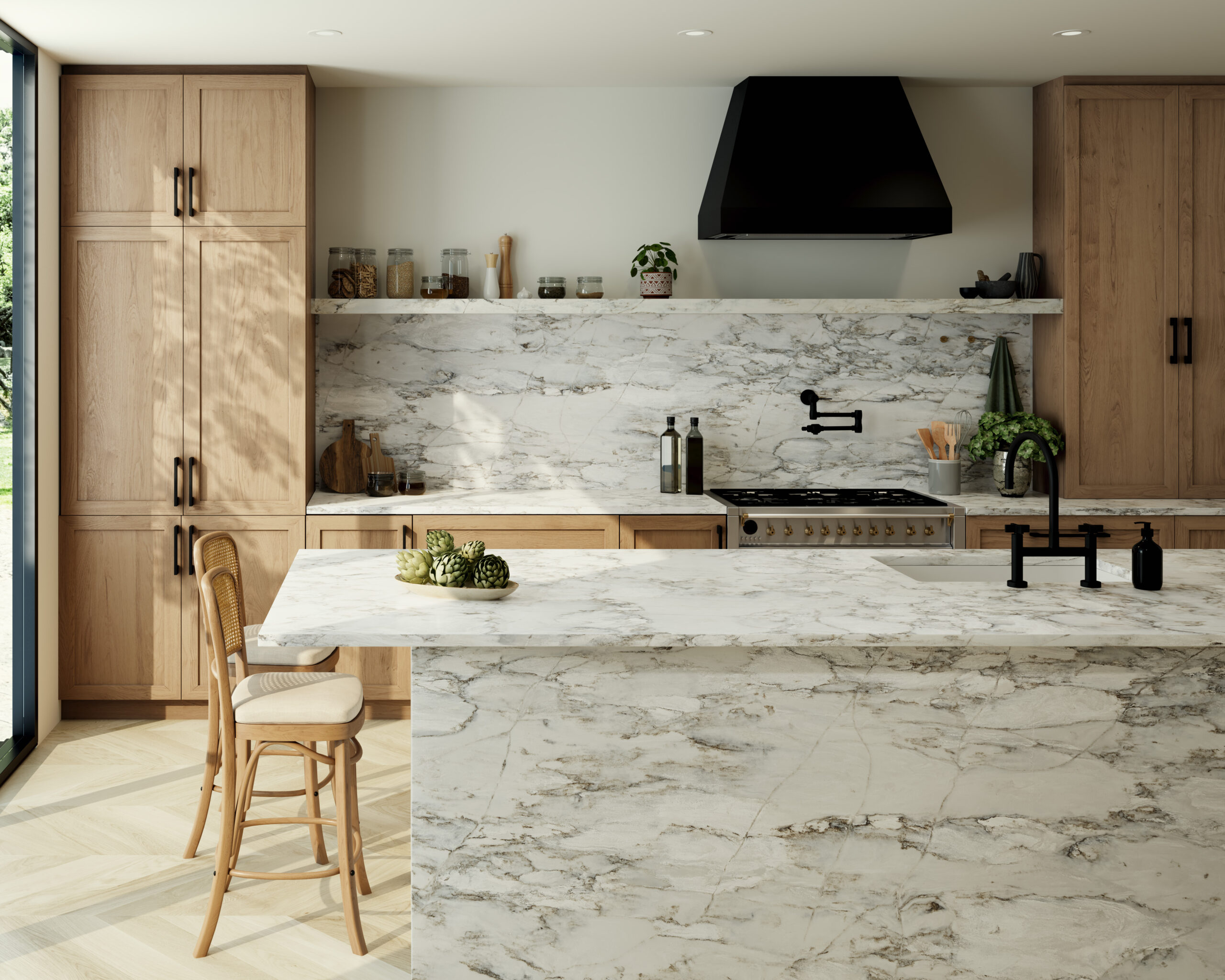 Antello: Soft and nuanced, Antello effortlessly combines classic elements with modern allure. Delicate, elongated veins in shades of grey and gold are anchored on a soft white base for a look that emulates natural marble. Antello offers a timeless aesthetic that seamlessly balances modern sophistication with enduring charm.